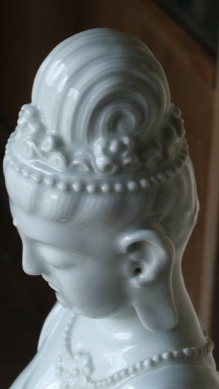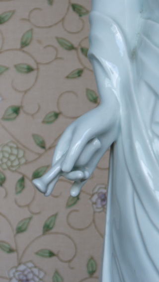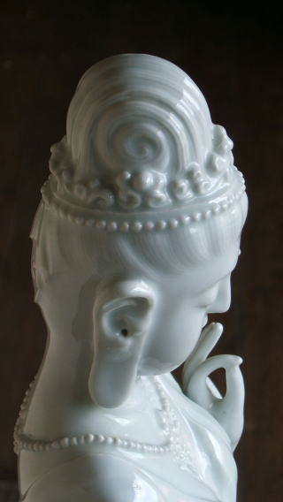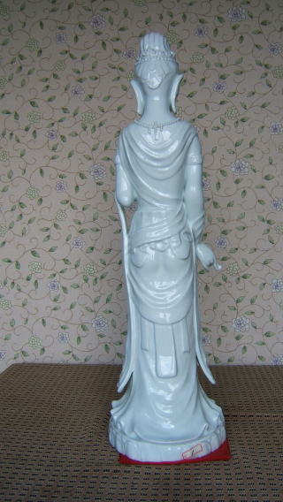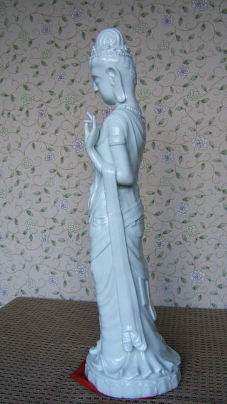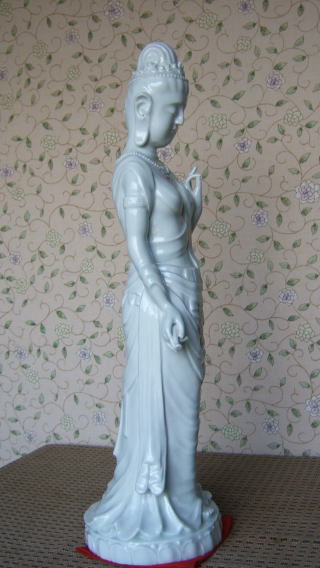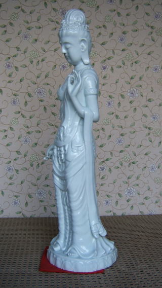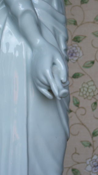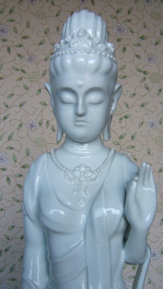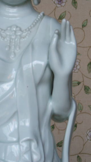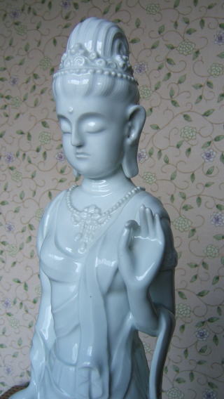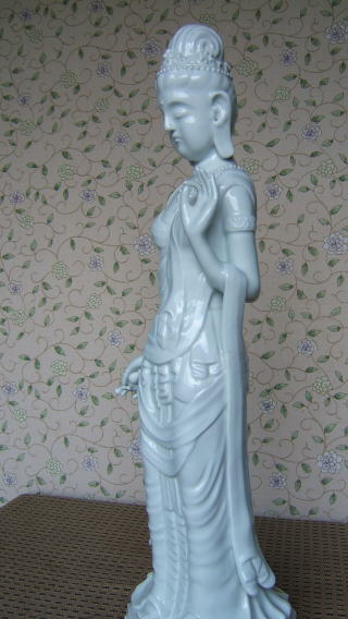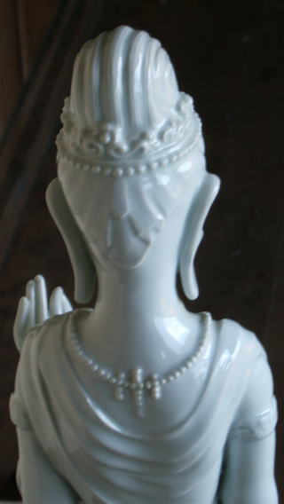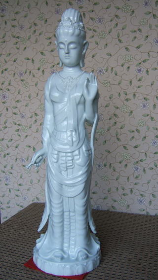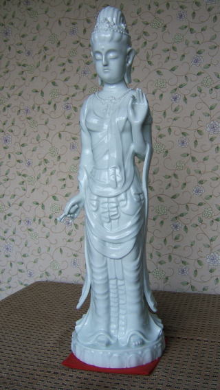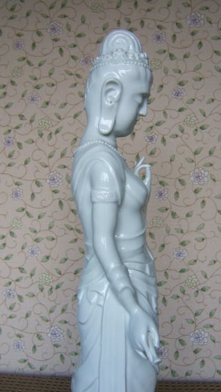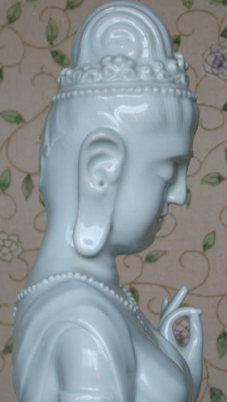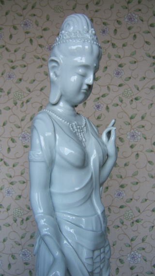 | 白磁観音菩薩 陽山 中里末太郎作 高さ約60センチメートル 1980代の作と思われる。従来の作とは観音様のお顔の形が大きく違う 様な気がします。個性豊かでよりインド人種に近い面立ちの福与かな感じがする。この作品を 製作する頃、よく多くの女性の顔や形を良く観察していた様な気がする。 ( 2008_11_25 )撮影 |